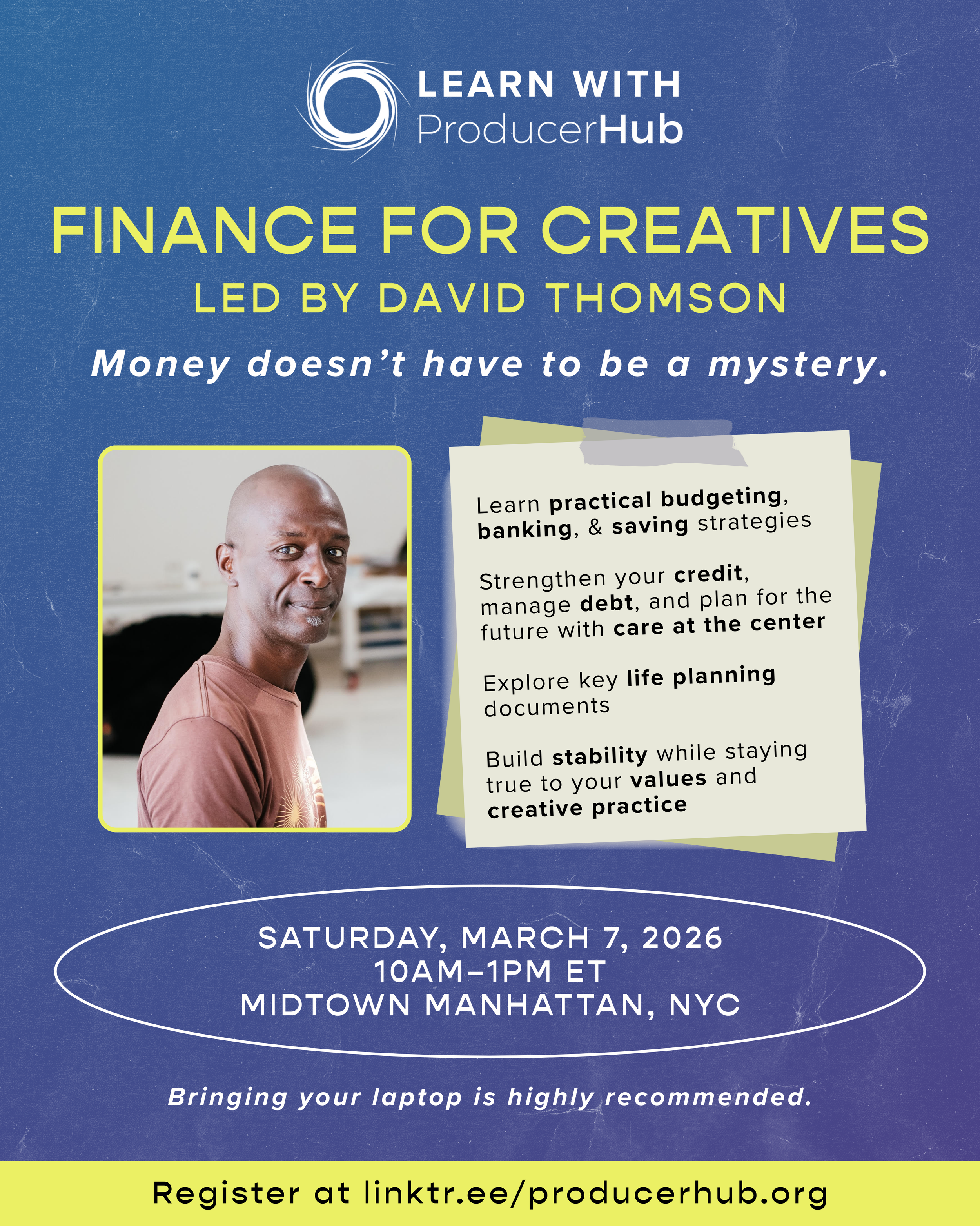 Money doesn’t have to be a mystery. Learn practical budgeting, banking, and saving strategies to build stability while staying true to your values and creative practice. Strengthen your credit, manage debt, and plan for the future with care at the center. We’ll also explore key life planning documents to ensure your financial and health decisions reflect what matters most to you.